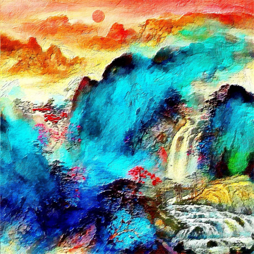于江不仅是一位技艺高超的画者,更是一位善于捕捉并转化光影魔力的魔术师。光与影的巧妙相遇,不仅带来了梦幻般的光影效果,更赋予了作品深邃的内涵与无限的想象空间,让作品充满了抽象性、象征性和梦幻性,构成了其独特的艺术魅力。在观赏这些作品时,观众仿佛被带入了一个梦幻般的世界:云崖清风、绿树晚霞、小桥流水、流云光影,以及满面笑容的白发老奶奶、身着旗袍的中国淑女、雄伟壮观的长城……无论是山河景色的壮丽与柔美,还是人物与静物的细腻与传神,都激发着人们的遐想与情思,让人流连忘返。光与影的色彩、明暗、动静之变,在作品中完美地呈现,给予观众强烈的视觉冲击力和艺术感染力。